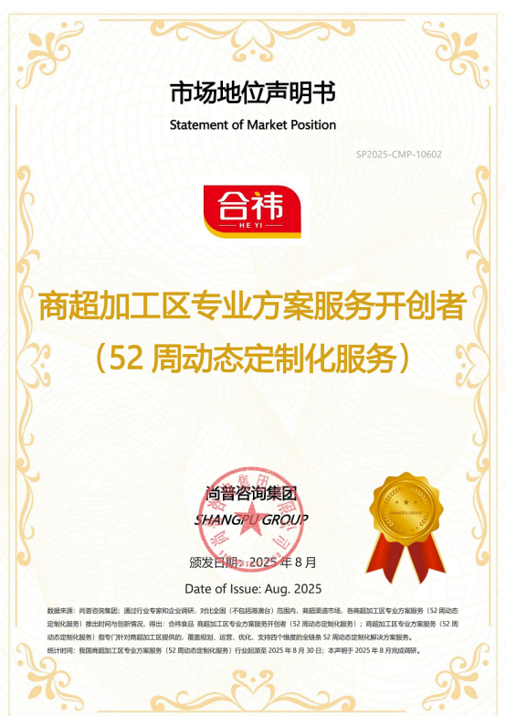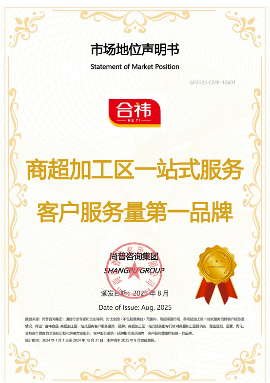 2025年8月,尚普咨询集团向合祎食品颁发市场地位声明书。合祎食品荣获【商超加工区一站式服务领导品牌】、【商超加工区一站式服务客户服务量第一品牌】、【商超加工区专业方案服务开创者(52周动态定制化服务)】三项市场地位声明,标志着其在速冻面米制品行业的标杆地位及市场的高度认可。